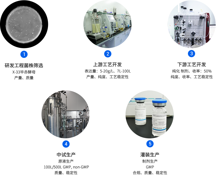 k8凯发生物已成功建立毕赤酵母CMC平台,现在已具备多个完整项目开发经验。毕赤酵母CMC平台90%以上的项目产量在1g/L以上,纯化平台工艺,其整体回收率在50%以上。从细胞株构建到蛋白纯化仅需3-4个月,极大地缩短了项目开发时间。
